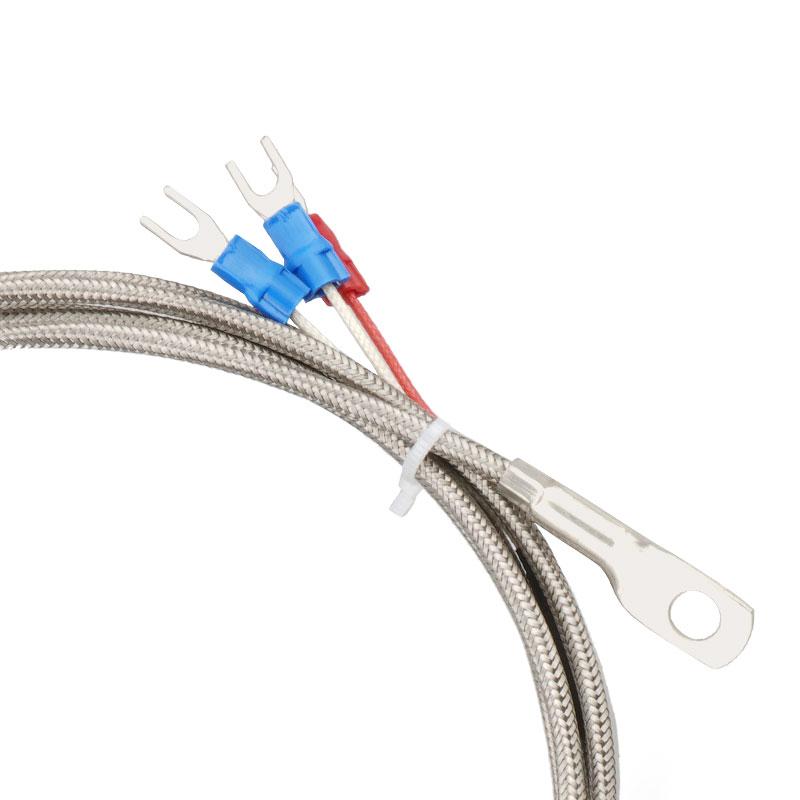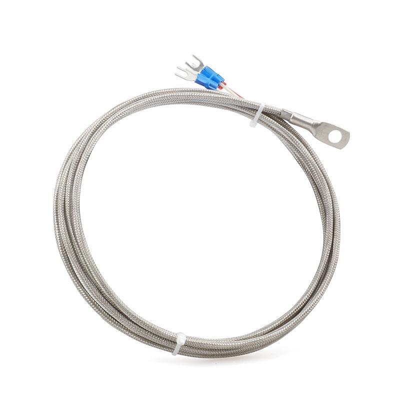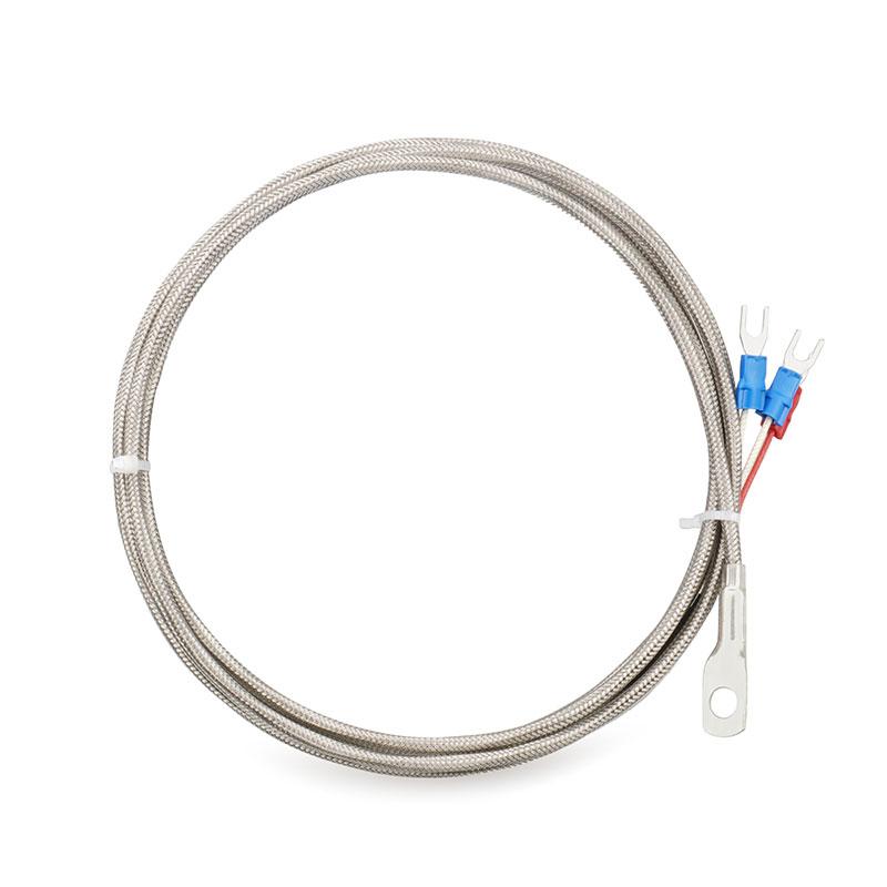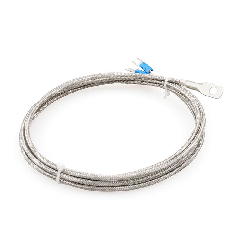 Датчик PT100 RTD с кольцевым клеммным разъемом; внутренний диаметр кольца 6 мм; кабель из нержавеющей стали в оплетке длиной 2 метра; диапазон рабочих температур до 200 °C.