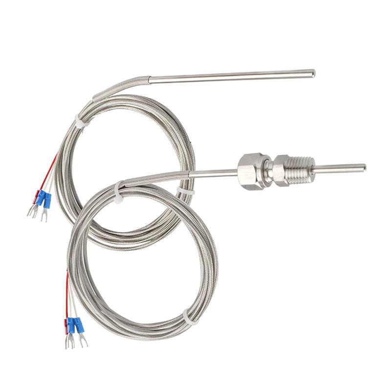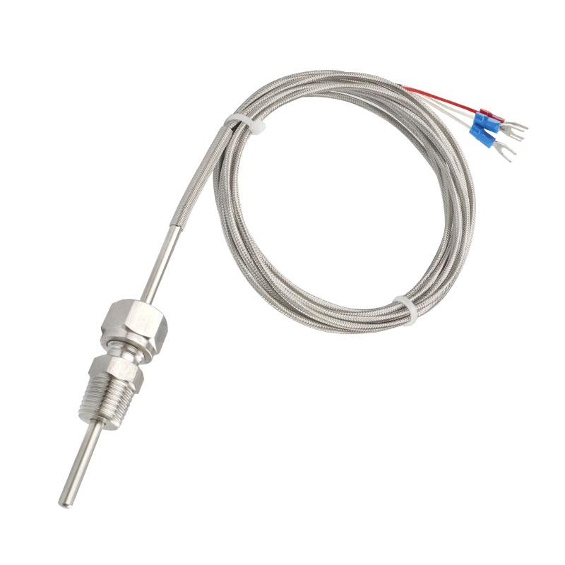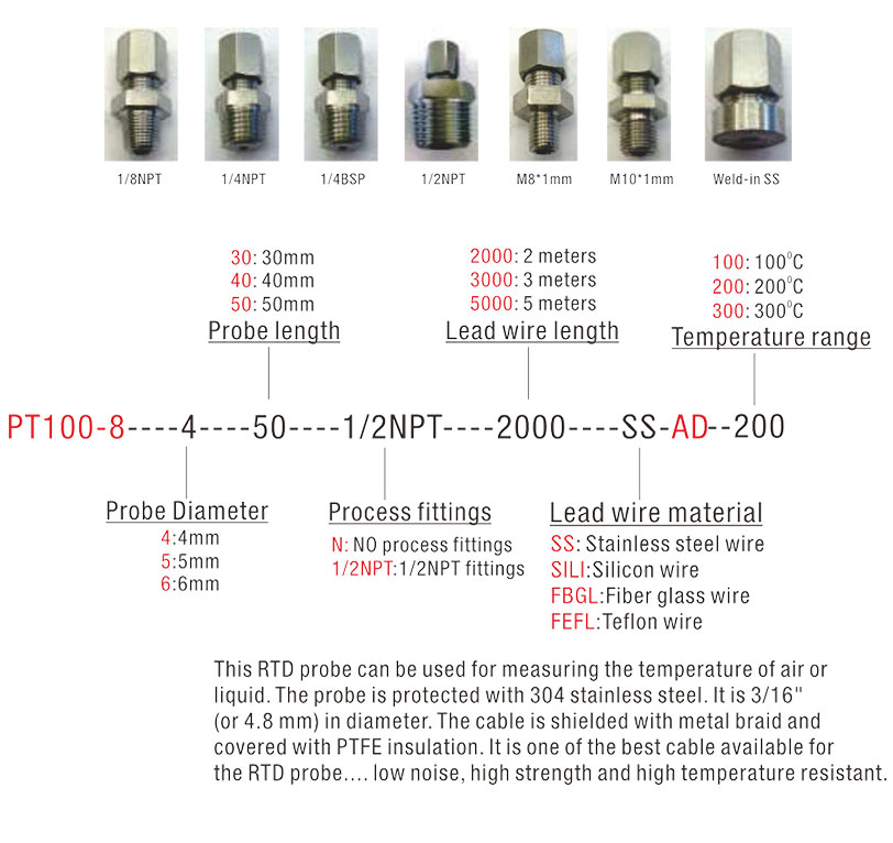 Зонд изготовлен из нержавеющей стали марки 304 и доступен в диаметрах 4 мм, 5 мм и 6 мм. Проводник экранирован металлической оплеткой и покрыт изоляцией из ПТФЭ, что обеспечивает низкий уровень шума, высокую механическую прочность и превосходную устойчивость к повышенным температурам. PT100-8 совместим с широким спектром технологических фитингов, включая резьбу NPT, BSP и метрическую резьбу, и доступен в водонепроницаемом исполнении, что делает его пригодным для измерения температуры воздуха и жидкостей в различных промышленных условиях.