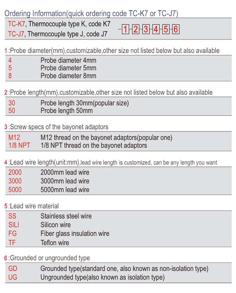 При заказе термопары с байонетным креплением серии Maxwell TC-K7 / TC-J7, пожалуйста, укажите полную конфигурацию, исходя из следующих шести параметров: диаметр зонда (4, 5, 8 мм или по индивидуальному заказу), длина зонда (30, 50 мм или по индивидуальному заказу), резьба байонетного адаптера (M12 или 1/8 NPT), длина соединительного провода (2000, 3000, 5000 мм или любая другая длина по индивидуальному заказу), материал соединительного провода (SS, SILI, FG, TF) и тип соединения (GD с заземлением или UG без заземления). Используйте формат TC-K7-1-2-3-4-5-6 (например, TC-K7-5-30-M12-2000-SILI-UG) для обеспечения точной поставки.